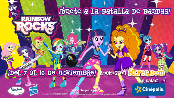 My Little Pony Equestria Girls: Rainbow Rocks, es la secuela de My Little Pony: Equestria Girls. La película fue anunciada por Hasbro como parte de un equipo de prensa en la Feria Internacional del Juguete 2014. La trama surge en Canterlot High, en el que tendrá lugar un espectáculo musical y Rainbow Dash, Applejack, Pinkie Pie, Rarity, y Fluttershy van a tener una banda, las Rainbooms. Pero cuando un nuevo grupo de chicas, las Dazzlings, llega a Canterlot High School, convencen a todo el mundo para convertir el escaparate en una Batalla de las Bandas. A medida que aumentan las tensiones entre todos una reformada Sunset Shimmer se da cuenta de que las Dazzlings no son chicas normales y están detrás de algo mucho más siniestro que simplemente ser nominadas la Mejor Banda en Canterlot High. Las Rainbooms piden a la princesa Twilight volver a su mundo para ayudarles a realizar un contra-hechizo musical para ganar la batalla que determina el destino de toda la escuela.